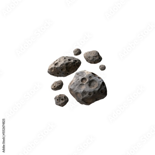 A cluster of small, grey, cratered meteoroids isolated on transparent background