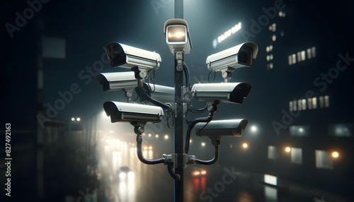 a cluster of surveillance cameras mounted on a pole at night. The illuminated cameras cast a soft glow, creating a dark and mysterious urban atmosphere.