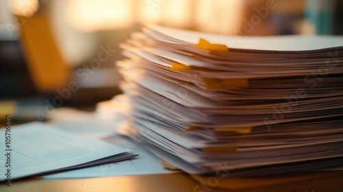 A clutter of neatly stacked papers sits on a desk, bathed in soft golden afternoon light, highlighting the busyness of the workspace surrounding it