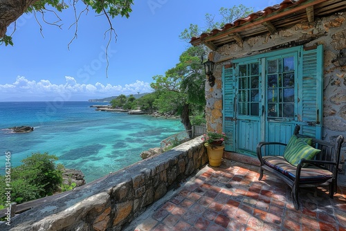 terrace, stone, blue, sea, water, ocean, coastal, turquoise, sky, cloud, tree, shutter, door, house, bench, view, scenic, serene, tropical, sunlight, bright, clear, landscape, nature, plant, green, foliage, brick, tile, wall, exterior, outdoors, summer, vacation, travel, relaxation, calm, beauty, peaceful, open, wood, old, antique, rustic, pot, flower, branch, warm