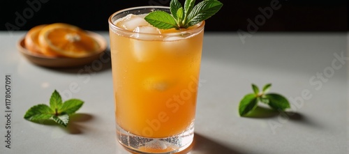 mandarin orange, cocktail, citrous, mint, evening, vibrant, savour, refreshing, tropical, lemony, minty, sweet, savoury, alcoholic, spirit, vodka, gin, tequila, triple sec, ice cube, cocktail glass, happy hour