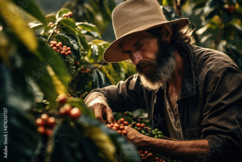 A coffee grower handpicking ripe coffee cherries on a lush hillside plantation. Concept of coffee cultivation and fair trade. Generative Ai.