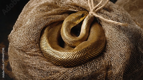 festivity, snake, gold, burlap, coil, reptile, mysterious, predator, unique, escape, smooth, high-coloured, minimalist, stunning, scale, display, wildlife, hidden, elegant, shimmering, twirling, creature, capture, fauna, exotic, enchanting, allure, habitat, captivating, camouflage, species, sack, closeup, wrapped, snake, tropical, wild, fascinating, animal, texture, pattern, beauty, nature, adventure, environment, natural, organic