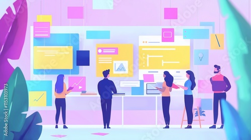 A collaborative workspace, a diverse team engaged in app development, with laptop, brainstorming people discussions creating a productive innovative atmosphere. teamwork, technology, creative project