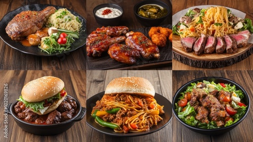 A collage of six different food dishes, including chicken wings, steak, pasta, and a burger. Each dish is presented on a plate with a wooden background.