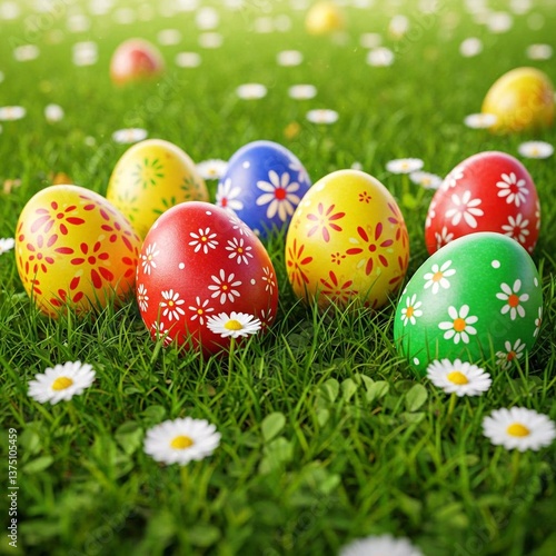 A collection of 6 painted easter eggs green meadow grass & daisies with a transparent background,template celebrating a Happy Easter with cut painted, flower,