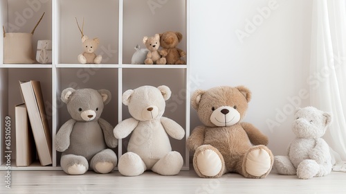 A collection of adorable stuffed animals neatly arranged in a child's room, creating a cozy and colorful atmosphere. Generative AI