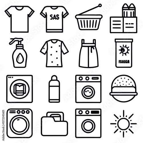 laundry, icon, t-shirt, basket, detergent, washing machine, spray bottle, clothes, sun, folder, household, cleaning, domestic, graphic, simple, outline, vector, black-and-white, line art, collection, set, symbol, design, element, clothing, care, hygiene, laundered, dry, fabric