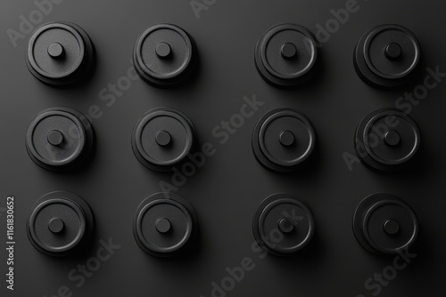 A collection of black weight plates is neatly organized on a dark surface, ideal for strength training and fitness activities in a gym setting.