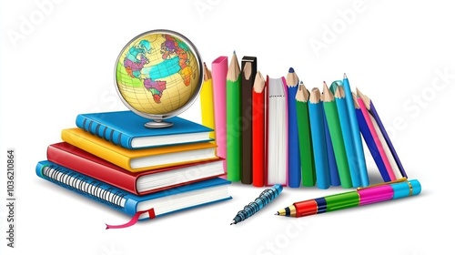 A collection of books, a globe, and colored pencils, symbolizing education and learning.