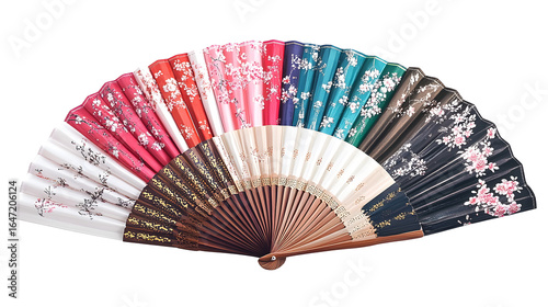 fan, hand, folding, colourful, oriental, asian, japanese, chinese, tradition, decoration, floral, flower, blossom, cherry, sakura, design, style, elegance, graceful, summer, heat, isolated, white, background, nobody, row, collection, souvenir, gift, travel, culture, artistic, fabric, silk, wood, brown, red, pink, blue, green, black, beige, beauty, cooling, open, object