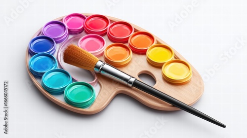 A collection of colorful paints and a paintbrush on a wooden palette, ready for creating art.