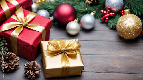 christmas, gift, box, decoration, holiday, present, ribbon, christmas, tree, celebration, bow, gold, ornament, winter, gift, gold, ball, red, surprise, green, season, decor