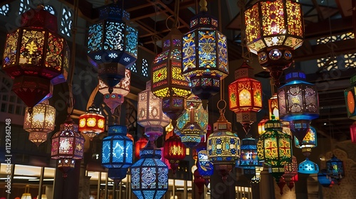 A collection of colorful Ramadan lanterns hanging from a ceiling, each intricately designed with Islamic geometric patterns