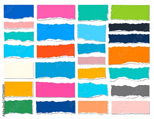 A collection of colorful, ripped pieces of paper, ideal for graphic design and visual displays.