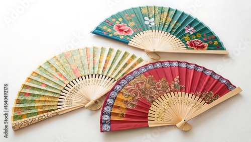 A collection of decorative hand fans on white