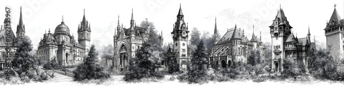 A collection of detailed sketched depicting mysterious and majestic historic mansions castles and estates in a variety of gothic victorian and vintage architectural styles set against eerie moody