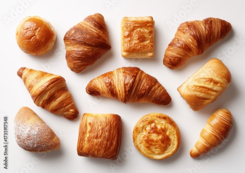 A collection of different pastries, including croissants and bread rolls
