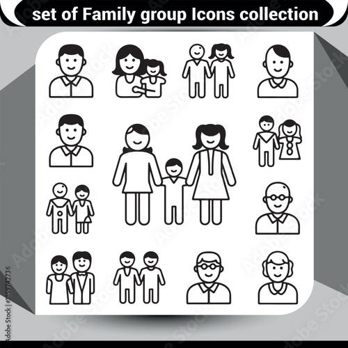 A collection of diverse family and people outline icons representing various relationships and age groups
