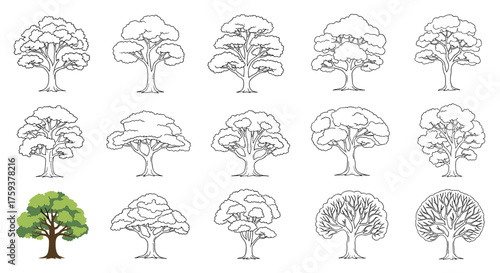 tree, illustration, drawing, vignetting, outline, line art, nature, botany, foliage, branch, trunk, variety, collection, set, design element, graphic, pattern, texture, detail, organic, growth, season, environment, background, element, resource, creative, visual, abstract, stylised, simple, complex, timberland, forest, garden, plant, vegetation