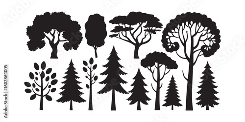 tree, silhouette, forest, nature, plant, landscape, design, element, illustration, graphic, vector, symbol, icon, isolated, background, black, white, leaf, tree branch, shape, art, drawing, outline, abstract, pattern, decorative, natural, environment, botanical, eco, simple, minimalist, clip art, collection, various, different, style, conifer, deciduous, evergreen