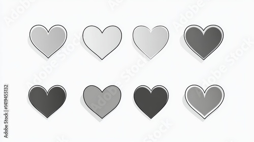 A collection of eight heart shapes in various shades of gray, illustrating love and affection