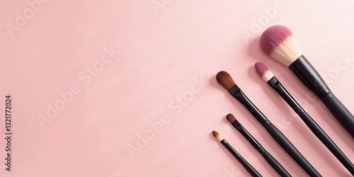 A collection of elegant makeup brushes arranged on a soft pink background, ready for application