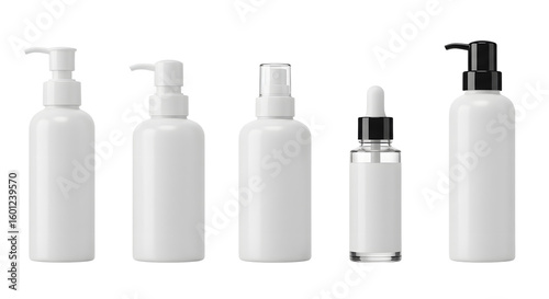 A collection of five minimalist white cosmetic bottles arranged on a clean surface, perfect for skincare product displays