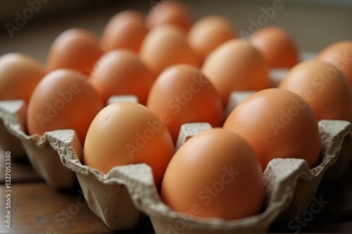 A collection of fresh brown eggs sits in a sturdy carton, reflecting soft light in a cozy kitchen. This inviting arrangement inspires delicious meals and baking creativity