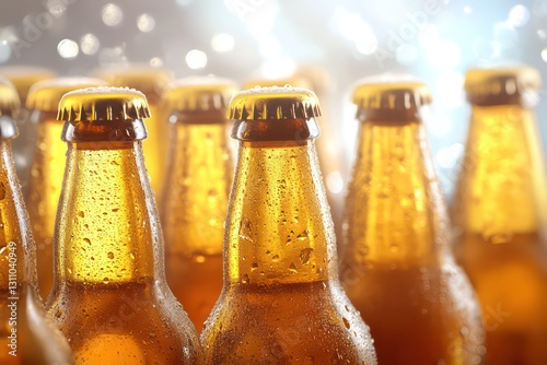 A collection of golden beer bottles, condensation sparkling on the surface, backlit with bright white glow, high-detail realism