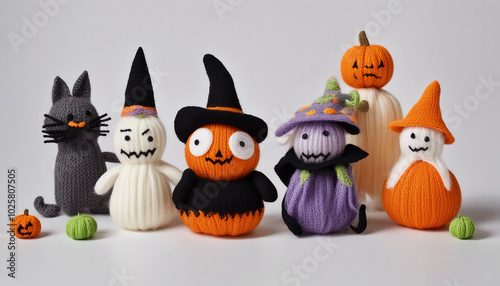 collection, halloween, knitted, toy, display, plain, white, background, skittish, festive, hand-made, decoration, pumpkin, ghost, bat, vibrant, colours, craft, creativity, seasonal, playful, cute, art, design, textile, craftsmanship, fun, celebration, character, atmosphere, novelty, unique, eerie, community, holiday, autumn, cheer, imaginative, whimsical, adorable, cosy, charme, home decor, gift, cartoon