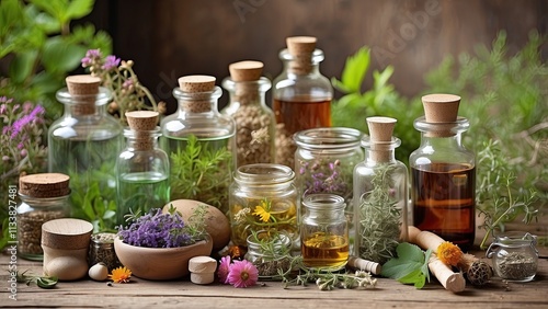 A collection of homeopathic components and medicinal herbs in a rustic location, symbolizing natural solutions for holistic health and alternative medicine... See More
