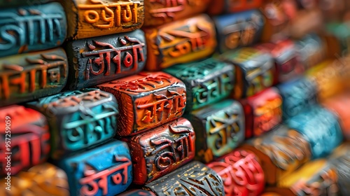 A collection of intricately carved colorful beads with tribal and geometric patterns, displayed in rows. Perfect for themes related to jewelry design, crafts, cultural art, and handmade accessories.