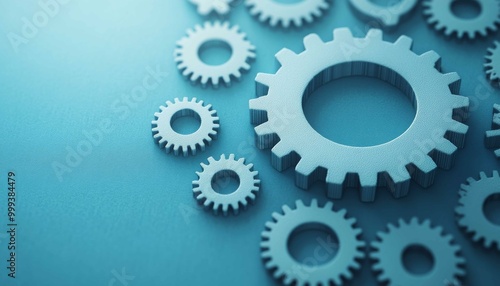 A collection of metallic gears against a blue background, symbolizing engineering, mechanics, and industry.
