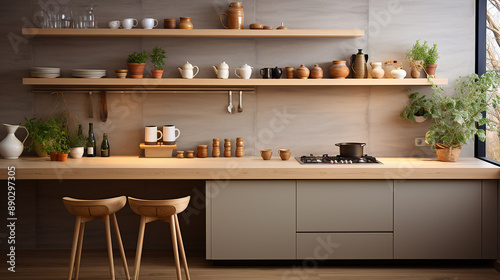 A collection of modern kitchen interiors featuring open shelving, minimalist design, and natural wood accents. The kitchens are decorated with plants, pottery, and contemporary lighting, creating warm