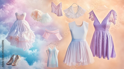 A collection of pastel-colored women's garments displayed against a dreamy sky.