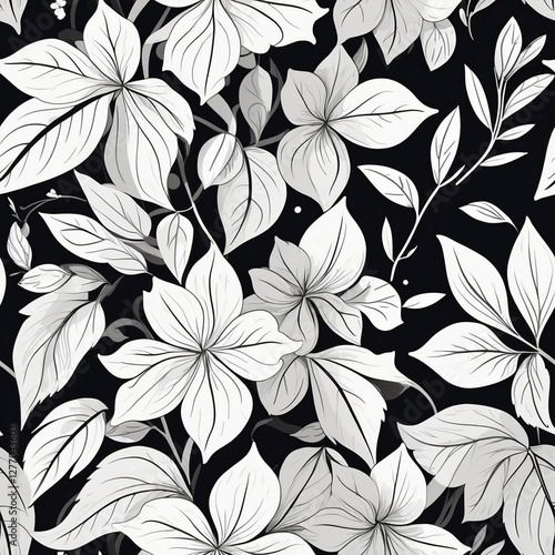 botanical, line art, floral, pattern, seamless, black-and-white, monochrome, leaf, flower, foliage, hand-drawn, nature, organic, illustration, decorative, design, intricate, detailed, artistic, vintage, textile, wallpaper, stationery, minimalistic, aesthetic, vignetting, modern, abstract, repeatable, elegant, sophisticated, vector, graphic, contemporary, classic, ornamental, digital artwork, symmetric, stylised, floral background