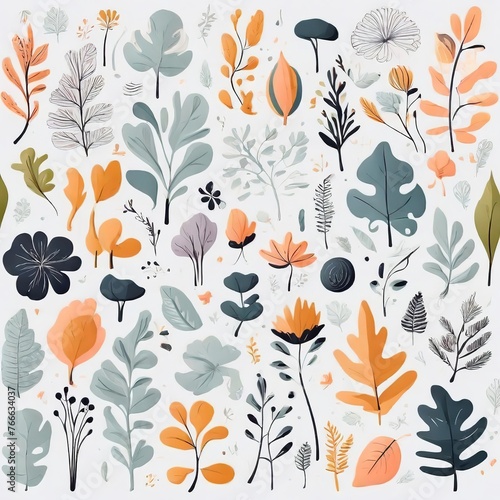 A collection of seamless pattern, colorful abstract plants and flowers. Hand drawn Collection of leaves and flowers. A close up of a pattern of flowers and leaves.
