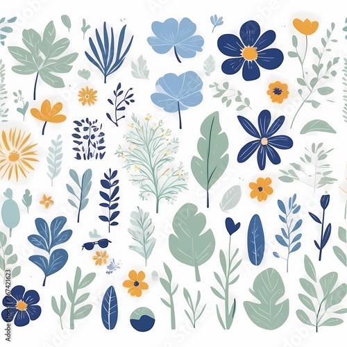 A collection of seamless pattern, colorful abstract plants and flowers. Hand drawn Collection of leaves and flowers. A close up of a pattern of flowers and leaves.