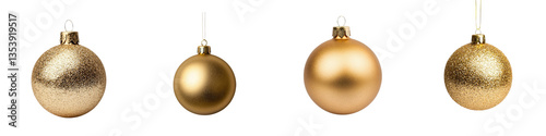 A collection of shimmering golden Christmas ornaments suspended against a clean white backdrop creating a simple yet elegant holiday display