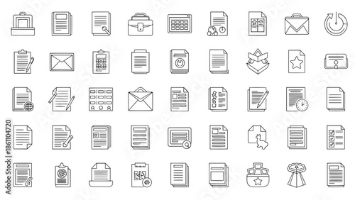 A collection of simple black and white line drawings representing various documents, files, and related office supplies. Each icon is distinct