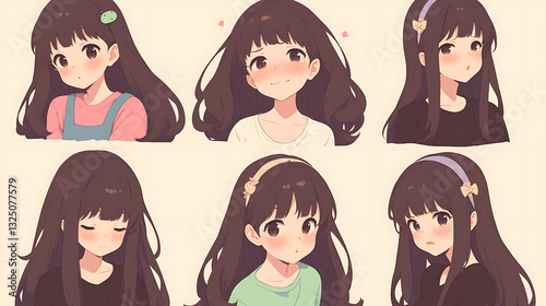 A collection of six adorable anime-style portraits of a girl with long brown hair and various expressions