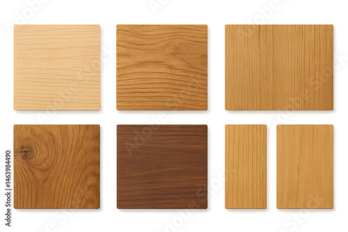 A collection of six wood samples, showcasing different finishes and grains in various shades and textures. Concept Wood Finishes, Grain Patterns, Color Variations, Texture Diversity