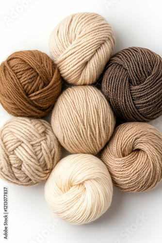 A collection of soft yarn balls in various shades of beige and brown, arranged attractively on a light surface.