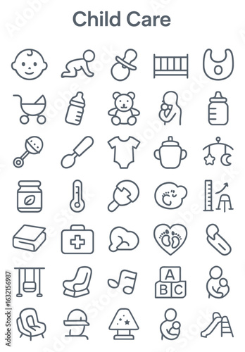 A collection of thin line icons representing various aspects of child care and baby essentials.