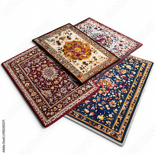 A collection of three decorative rugs in various patterns and textures arranged on a transparent background, high-resolution 3D render, soft shadows, people