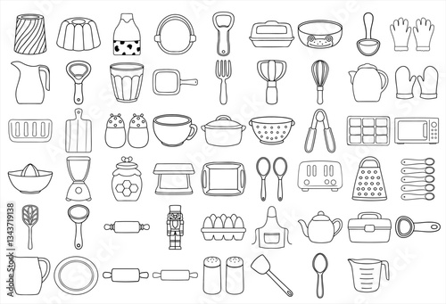 A collection of various kitchen utensils and appliances, illustrated in a simple line art style.