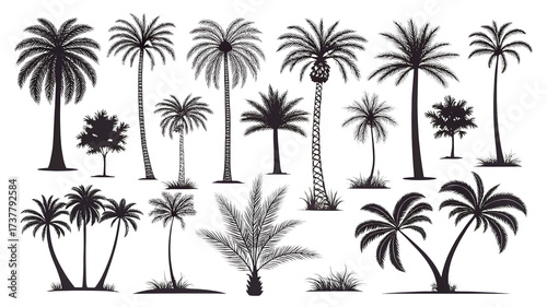 palm, tree, silhouette, tropical, plant, vector, island, nature, summer, vacation, beach, landscape, exotic, design, illustration, isolated, background, travel, holiday, sea, coast, symbol, graphic, element, drawing, art, artwork, botanical, flora, foliage, tree branch, leaf, trunk, sky, sun, sand, resort, paradise, caribbean, hawaii, florida, vintage, retro, style, pattern, texture, decoration, clip art, stencil