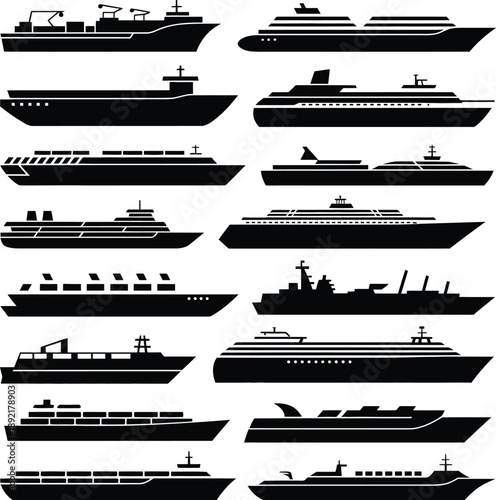 ship, boat, vessel, silhouette, ocean, sea, water, maritime, transportation, cargo, cruise, ferry, naval, fleet, sailing, nautical, black, white, graphic, illustration, icon, set, collection, various, diverse, shape, form, design, structure, marin, industry, commercial, travel, tour tourism, recreation, leisure, adventure, exploration, discovery, voyage, journey, floating, object, graphic, art, creative, digital