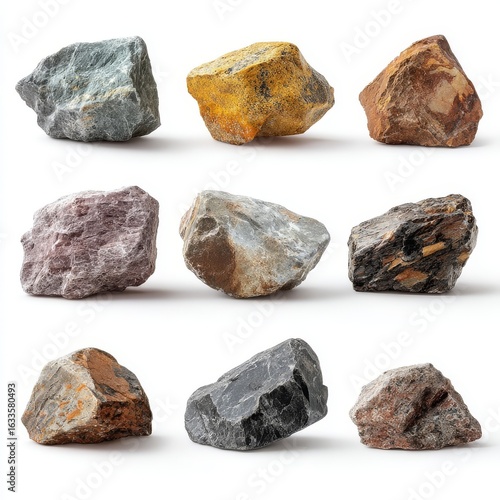 A collection of various stones and rocks arranged in a grid, each displaying unique textures and colors. The rocks feature an array of natural colors